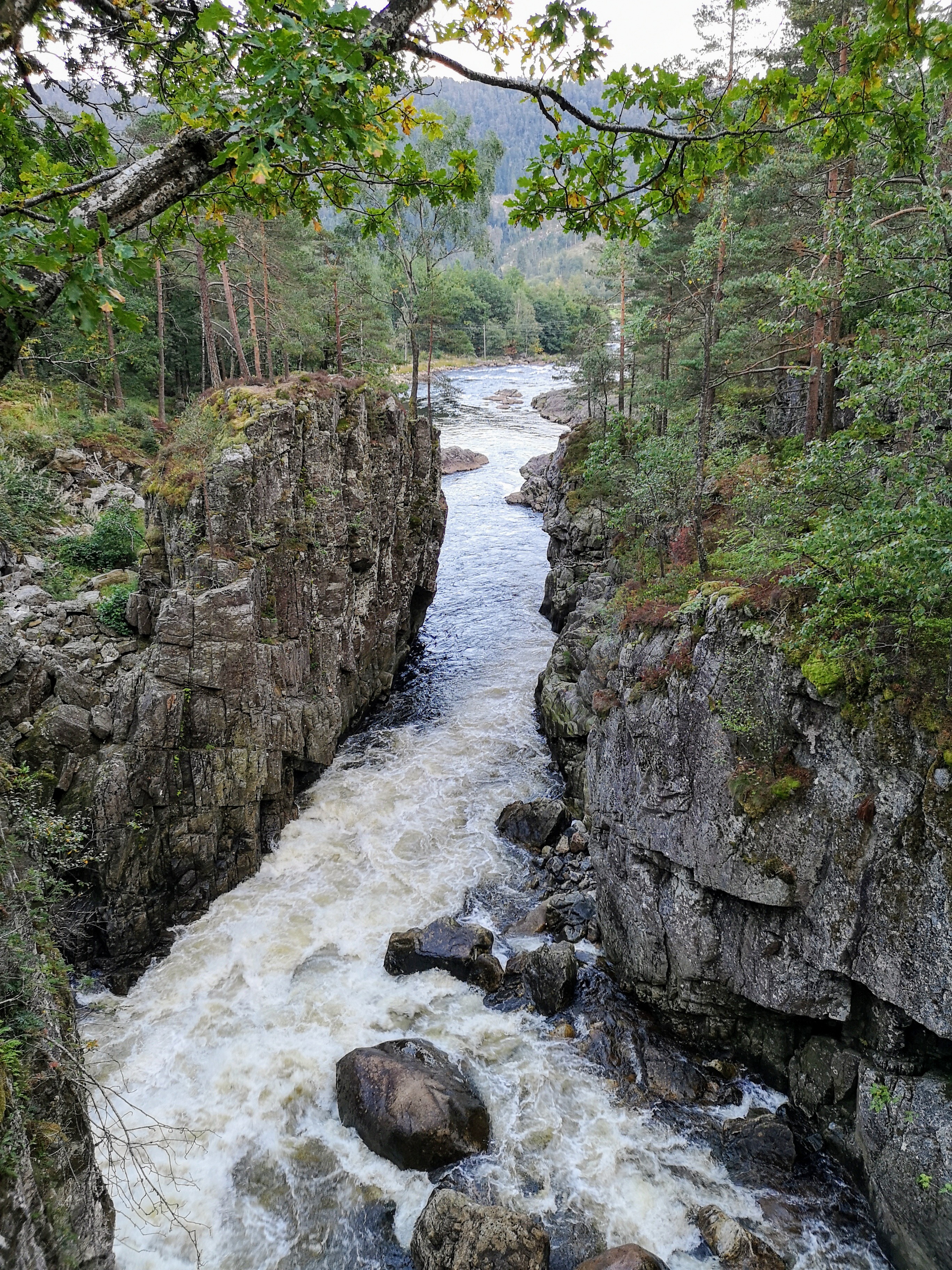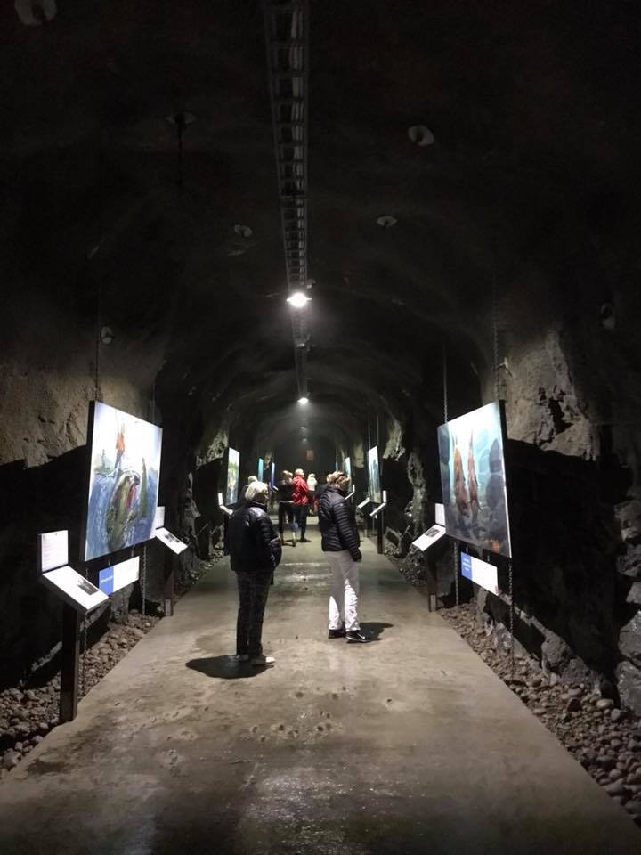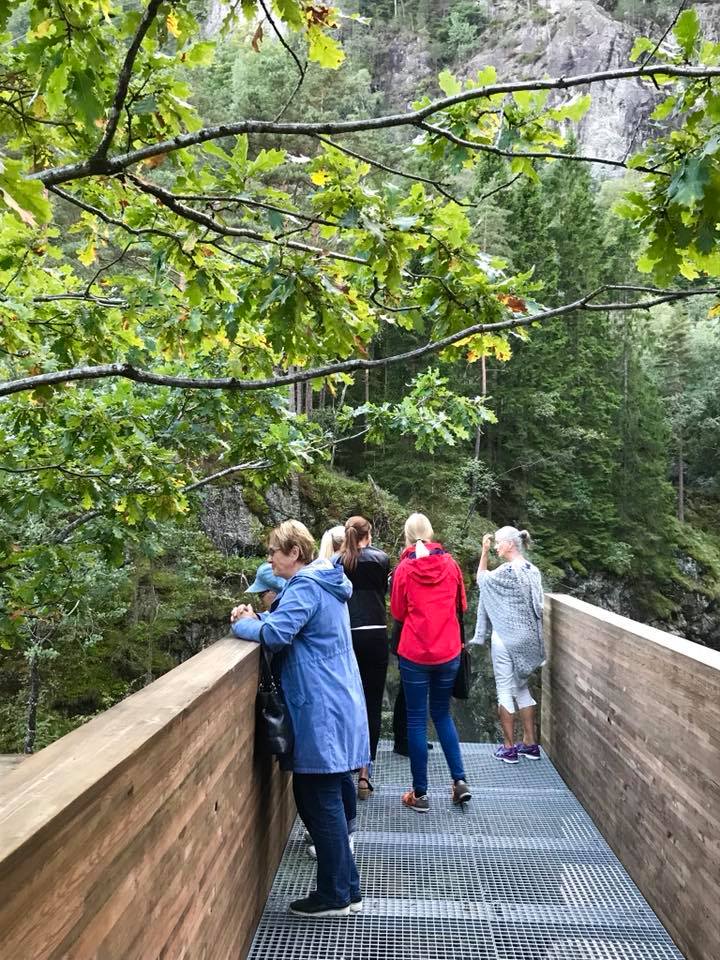 Vi fikk gå ned til laksetrappen og hørte bruset fra fossen. Vi så mange store laks på vandring og mange små som var klekket i kulpen. Et meget imponerende anlegg, flott arkitektur og nydelig natur. Alt i alt en inspirerende og lærerik opplevelse.