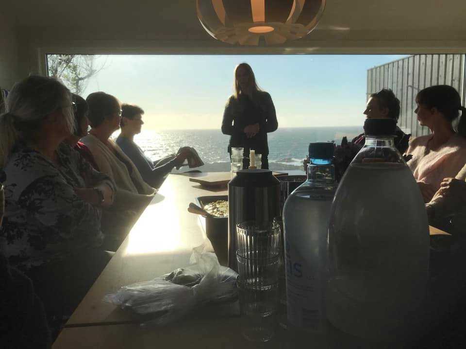 Vel fremme – et lite paradis. Et smykke av et hus og en gjestestue i naturen. Maarit fortalte om hvordan landet ble til og hvorfor folk kom hit. Vi skjønte hvorfor folk var her nå! Berit fortalte om Mathias Skeibrok, Listakunstneren vi er så stolte av. Både han og Berit kunne fortelle skrøner.